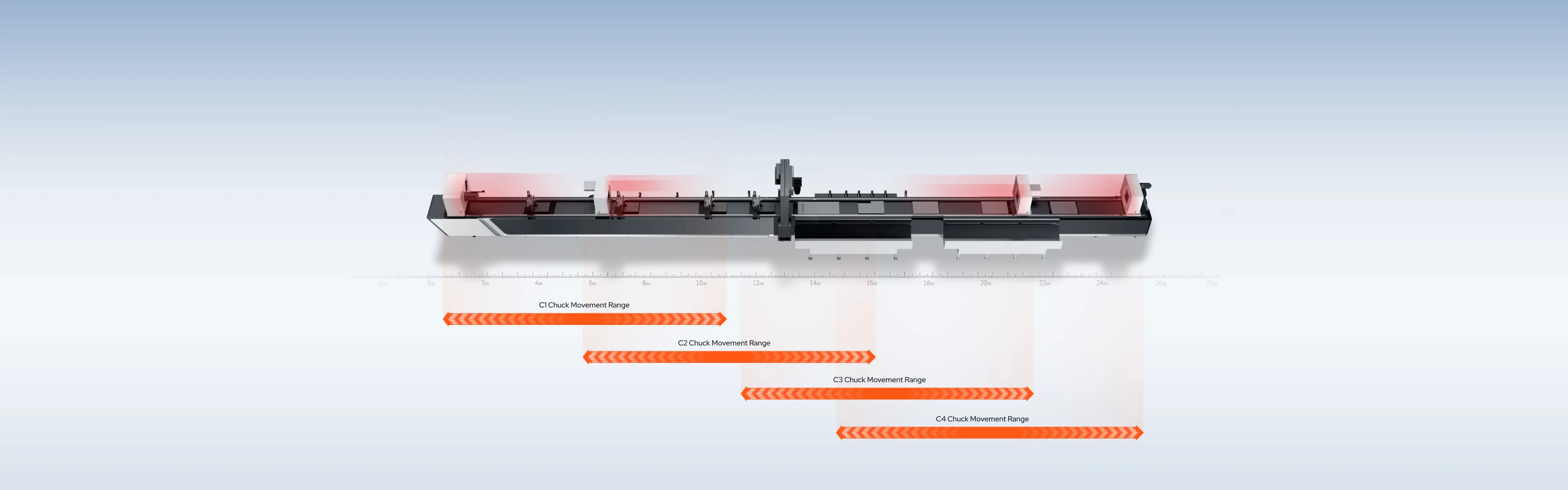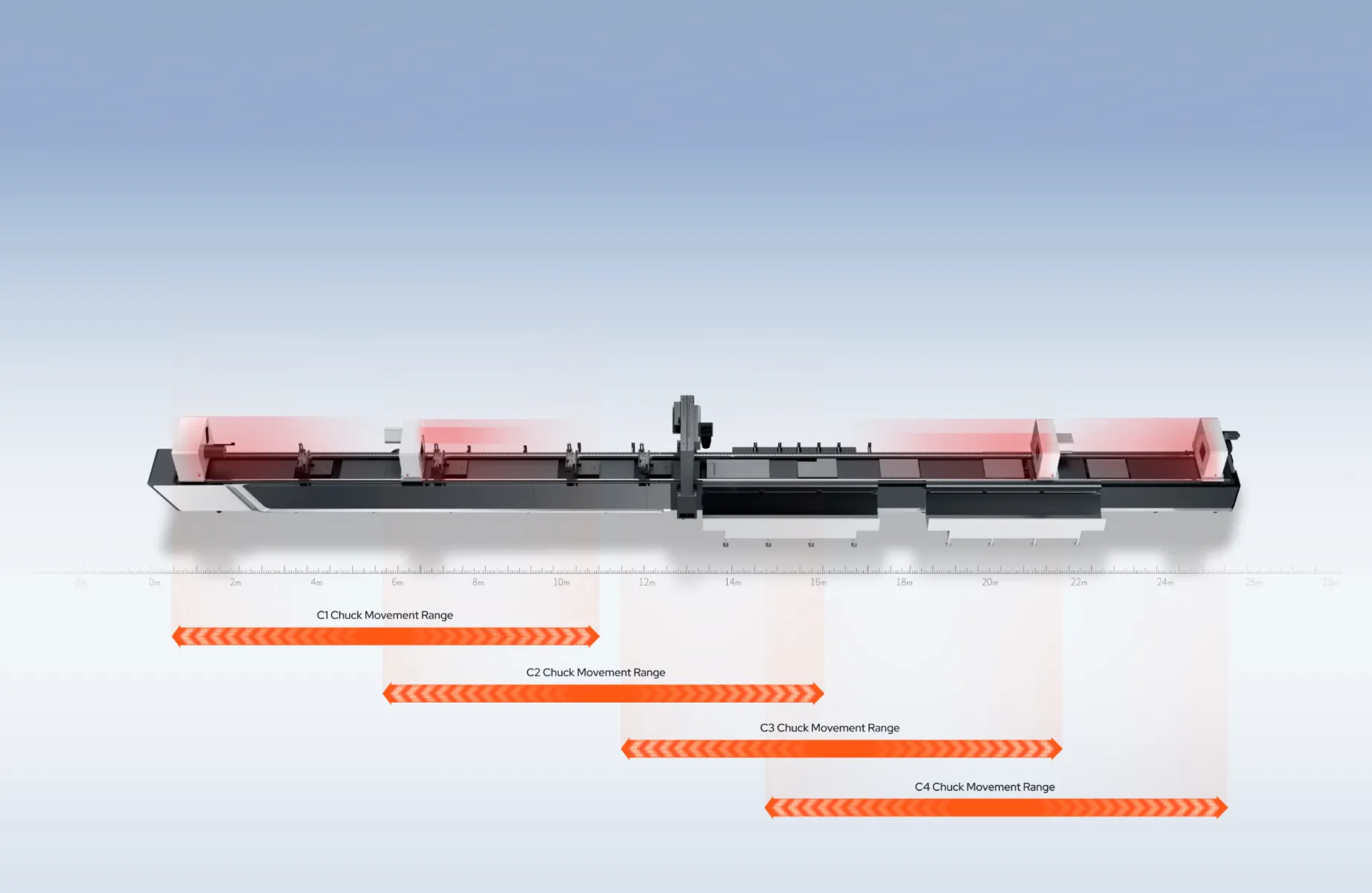 4チャック構造により、任意の長さのパイプの最終部分を切断する際に、材料を前方または後方に移動させることができるため、真の廃材ゼロ切断を実現します。
